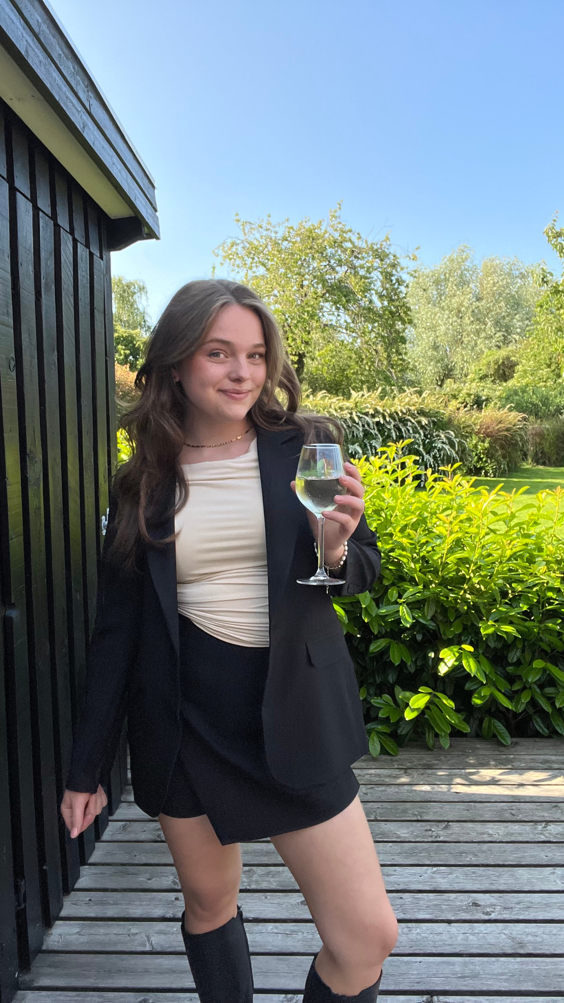 Modellen er 169 cm høj og bruger normalt størrelse M/38, og er her iført str. M. Produktet er normal i størrelsen.
