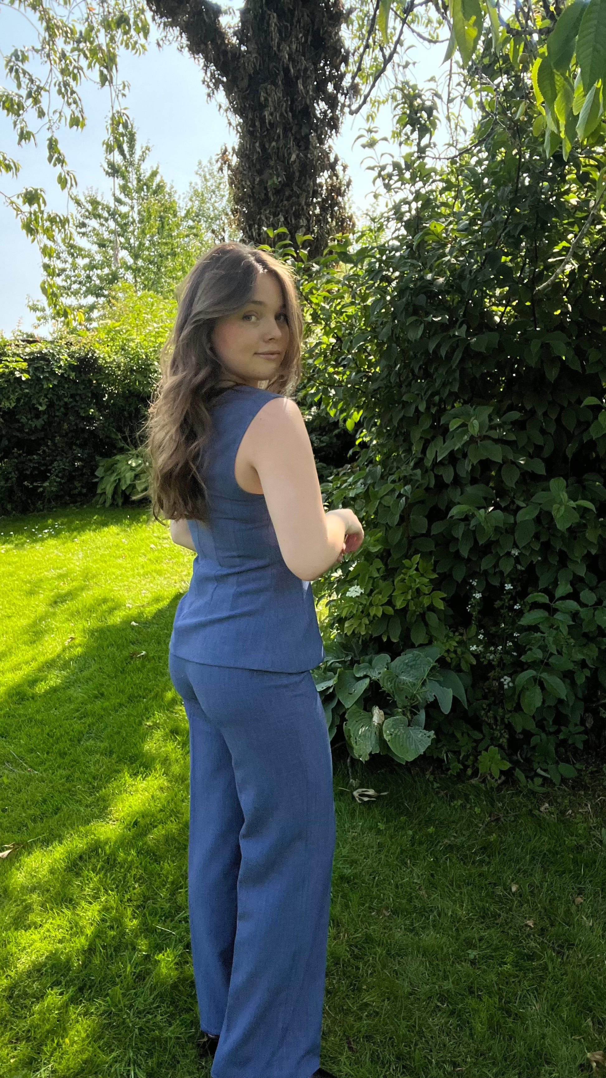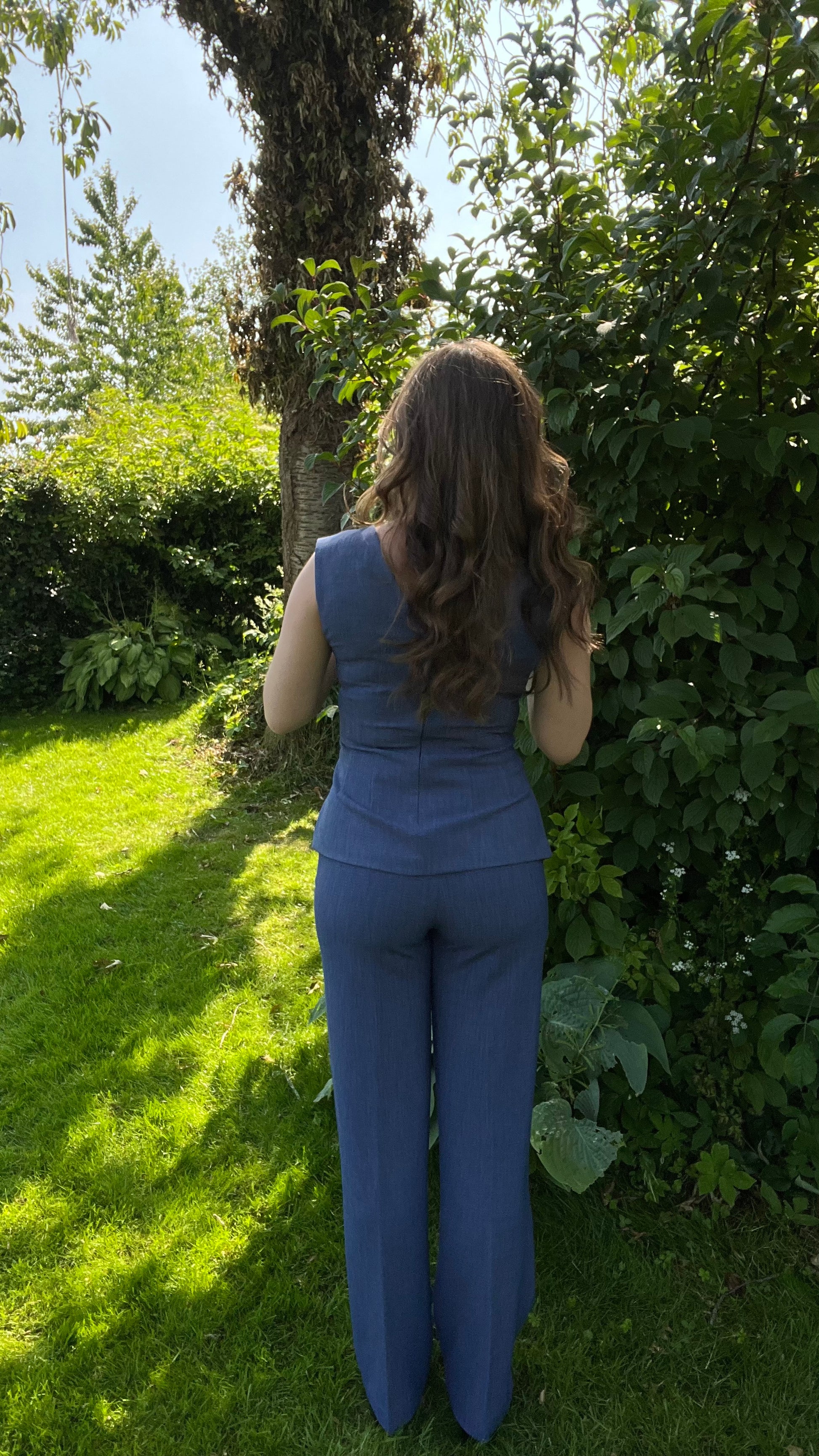 Bukser med høj talje, diskret knap- og lynlåslukning, pressefolder og sidelommer.