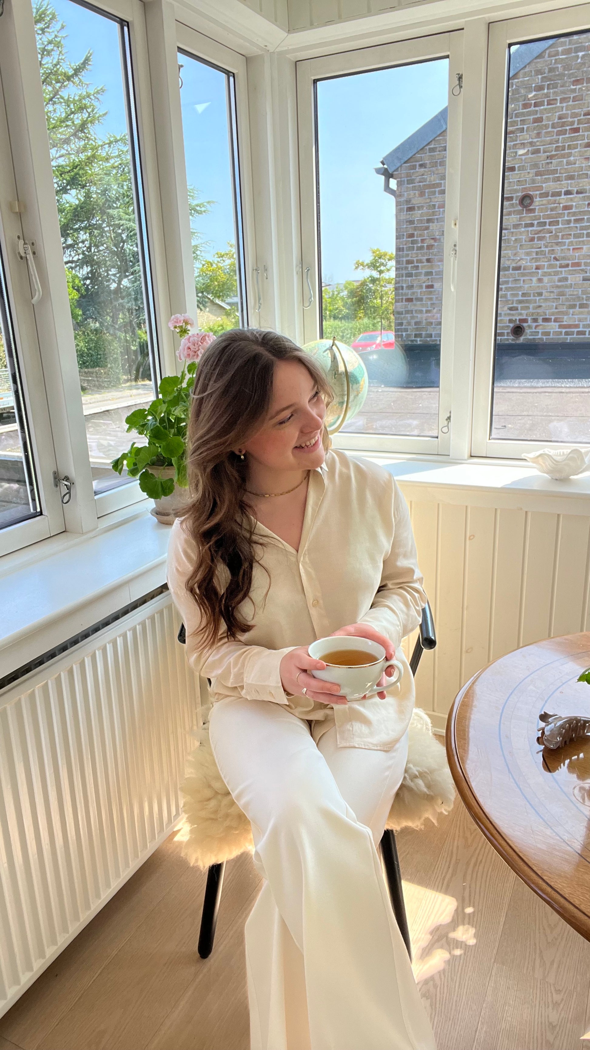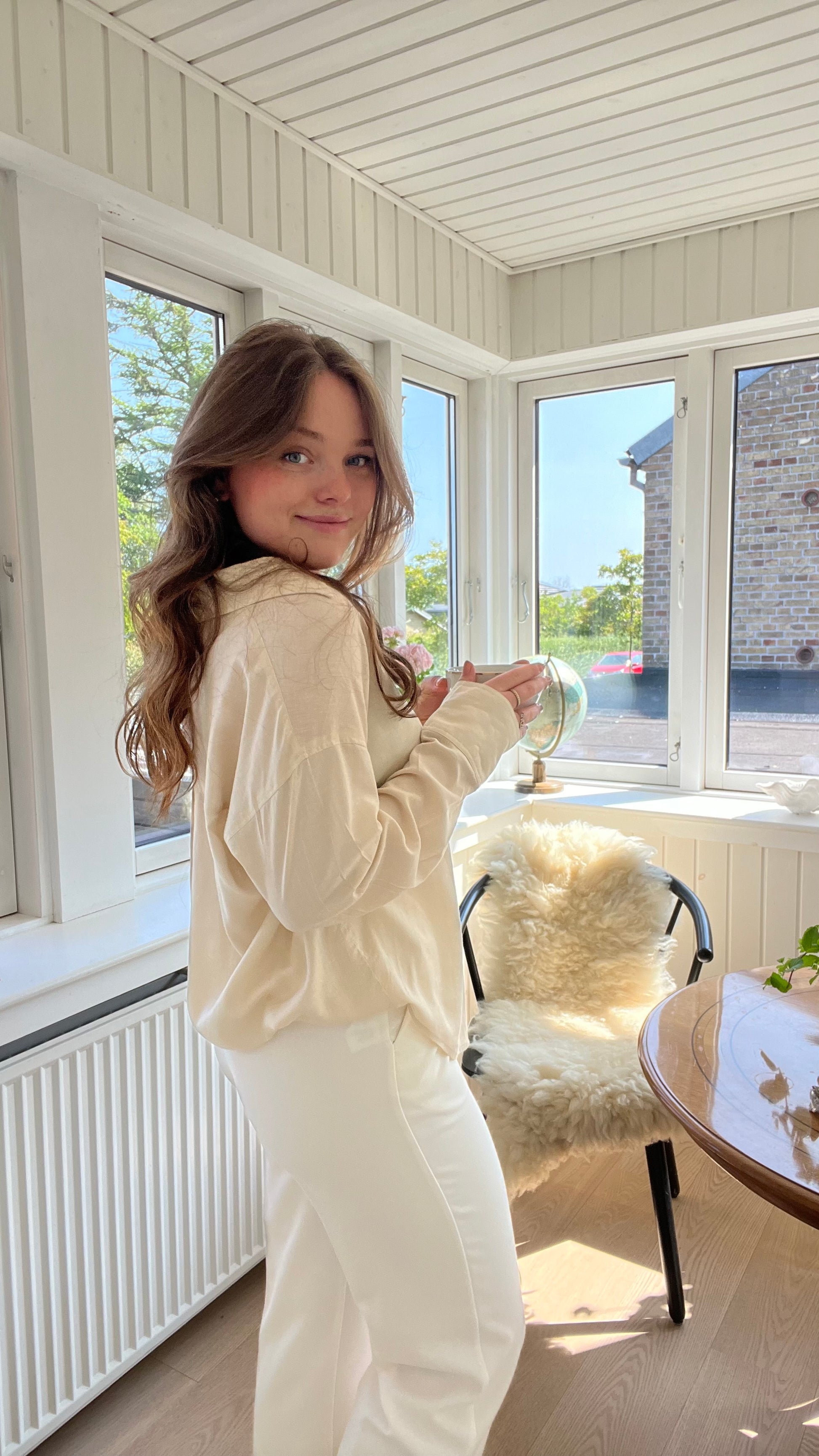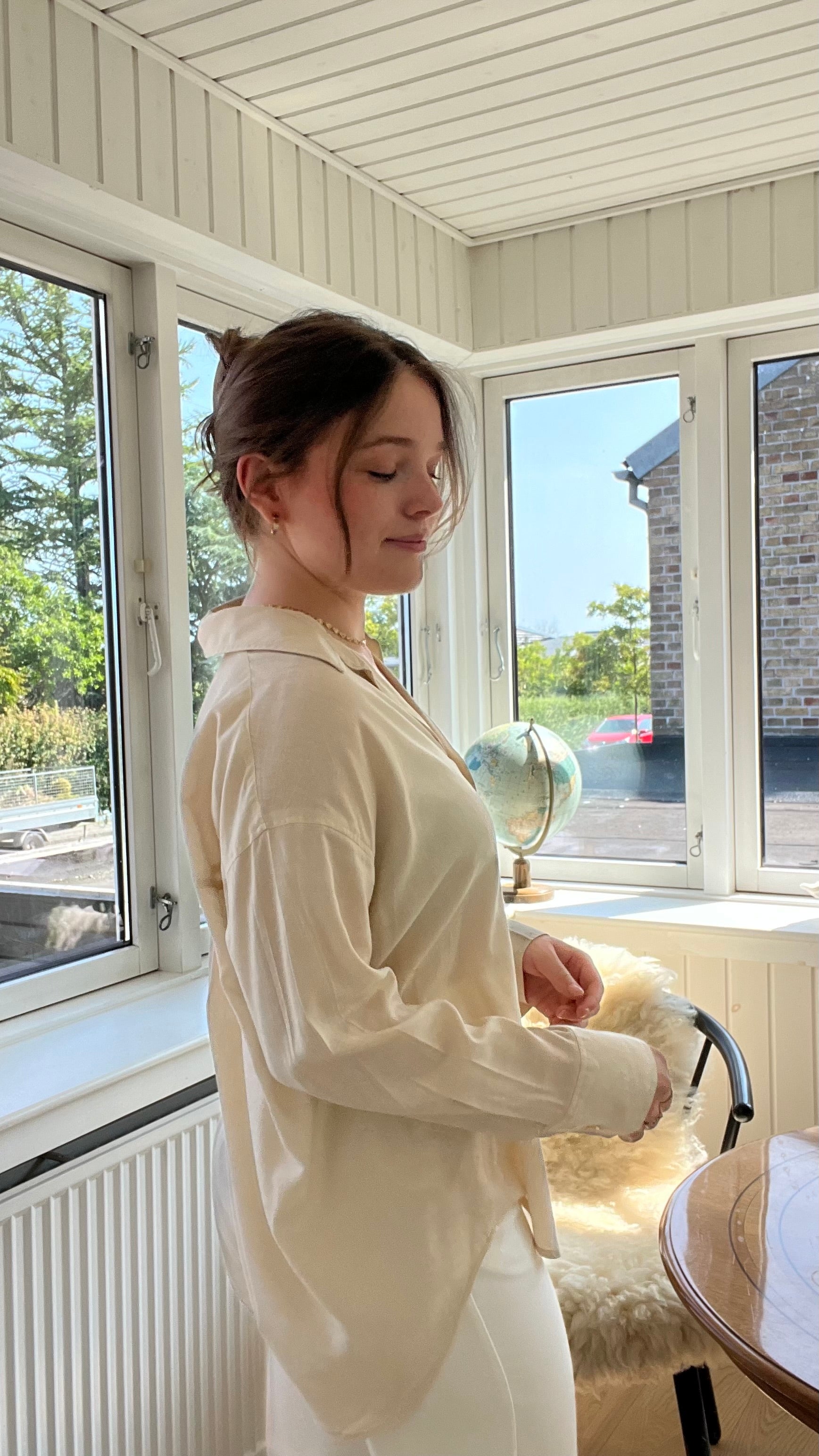 Modellen er 169 cm og bruger normalt str. M/38 og er her iført str. M. Denne style har en normal pasform. Hvis du ligger mellem to størrelser, anbefaler vi at tage den største, da man kan forvente at den vil krympe en anelse i vask.