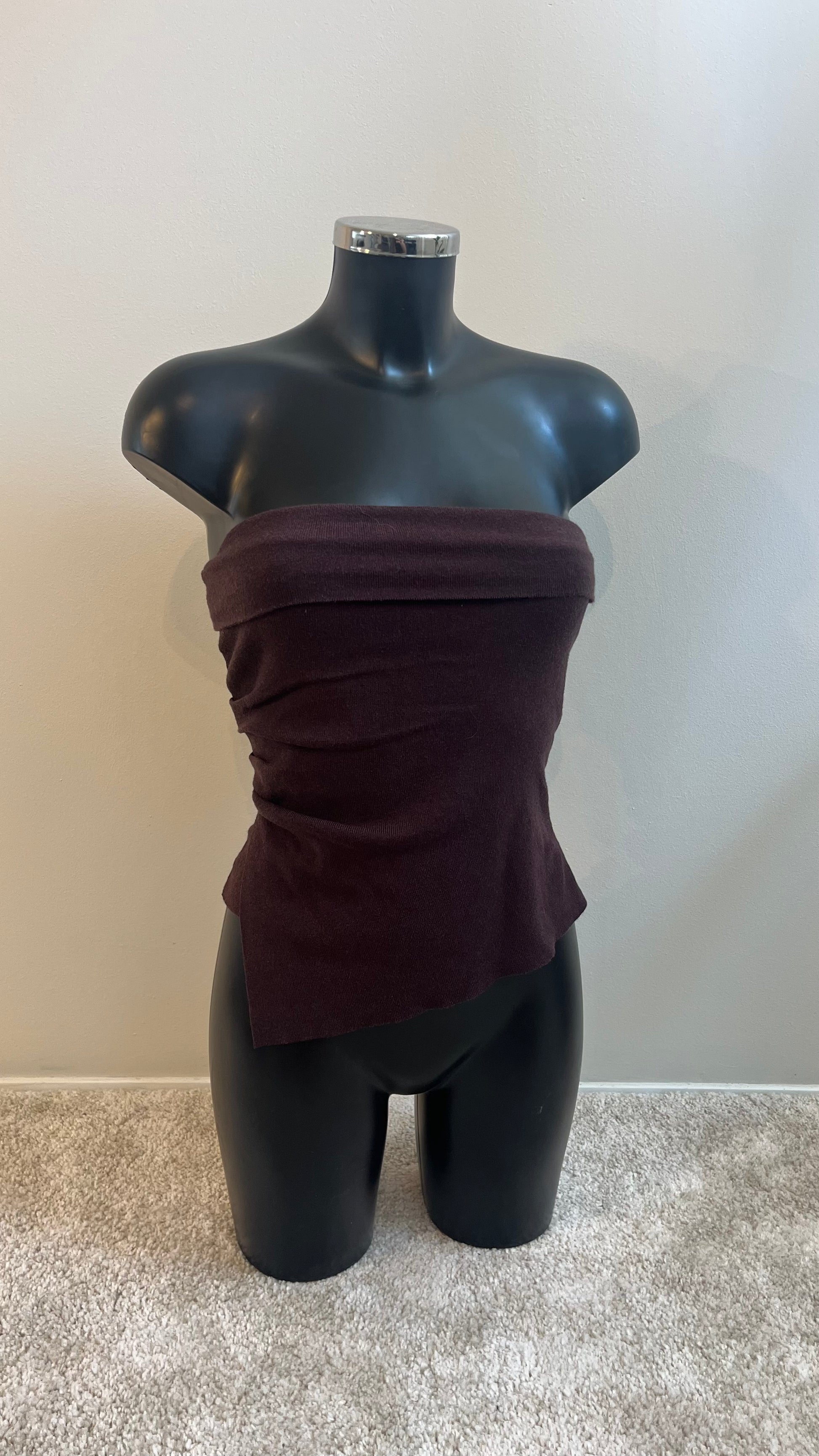 Stropløs top med figursyet pasform og asymmetrisk draperet front. Tæt strik-kvalitet.