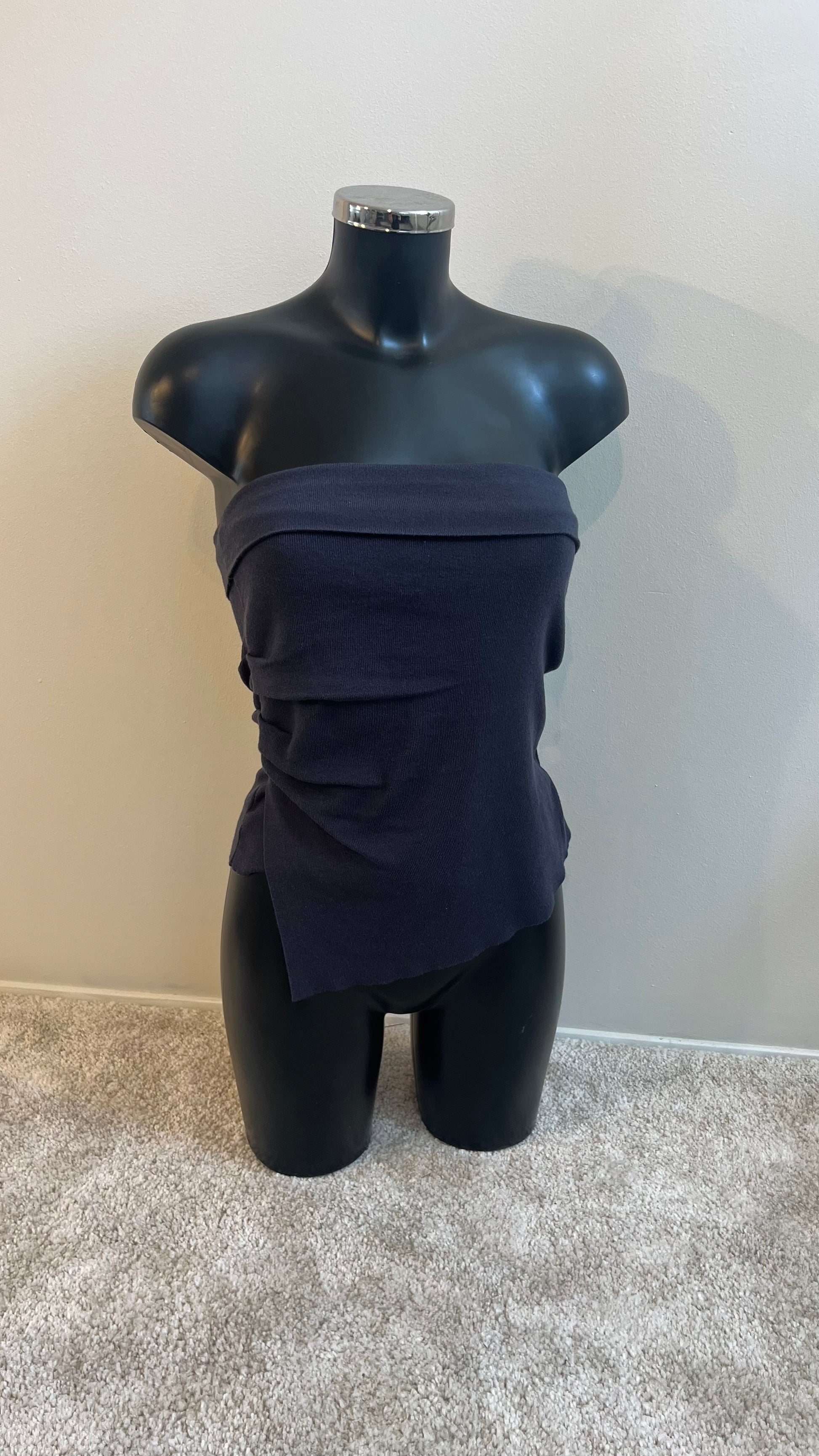 Stropløs top med figursyet pasform og asymmetrisk draperet front. Tæt strik-kvalitet.
