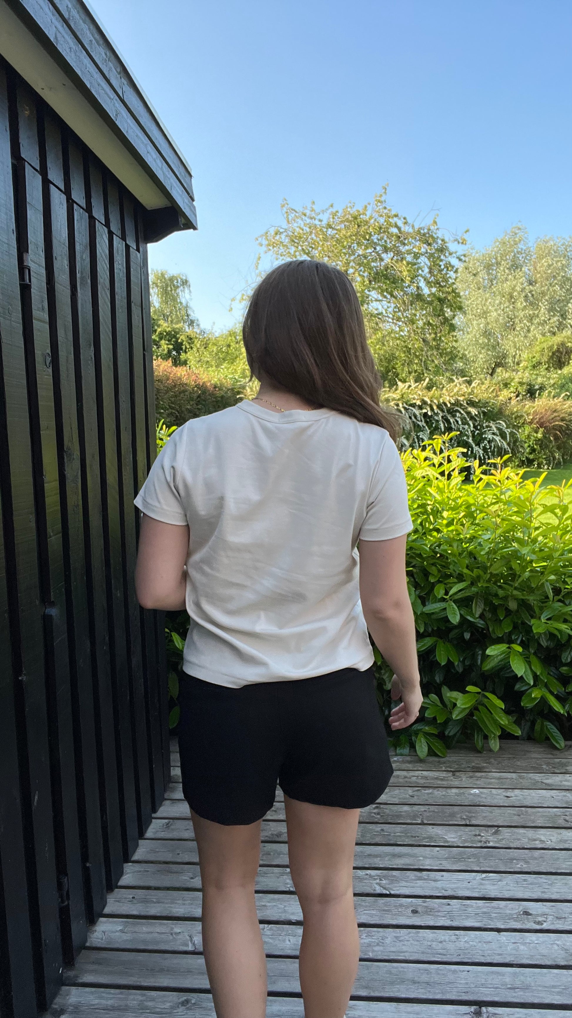 Modellen er 169 cm høj og bruger normalt størrelse M/38, og er her iført str. M. Produktet er normal til stor i størrelsen – vælg din normale størrelse for et lettere oversized fit.