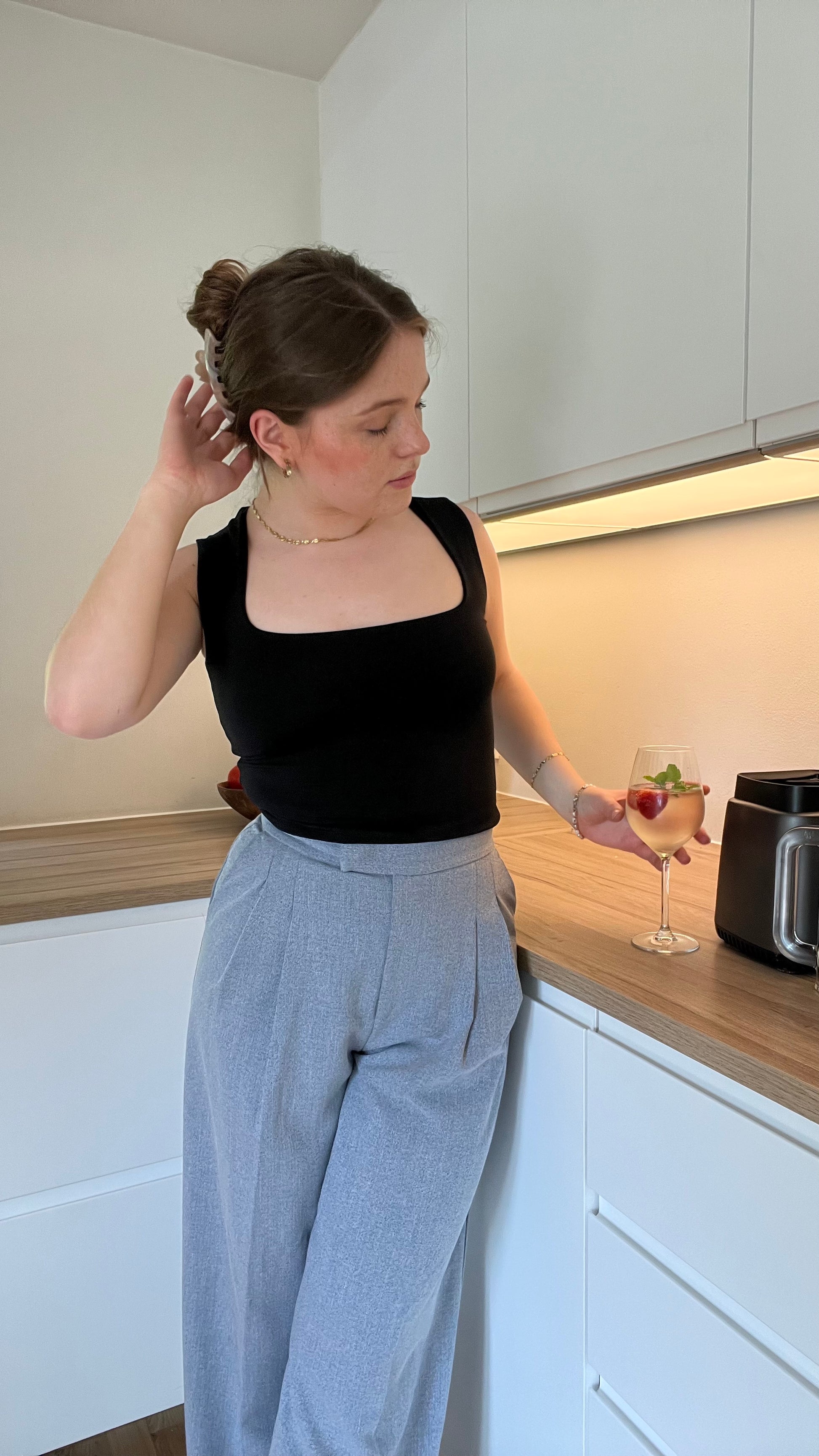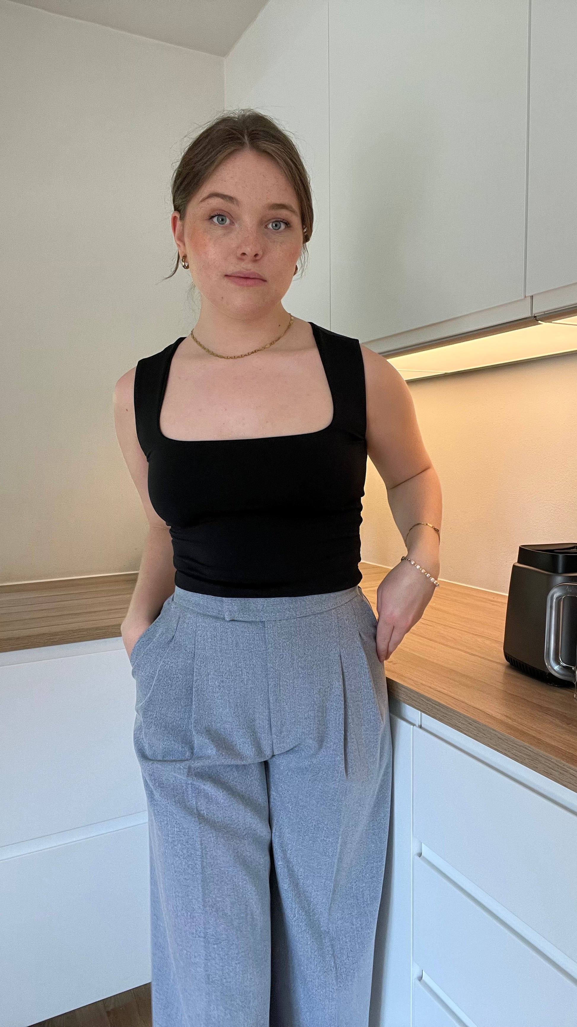 Ærmeløs kort top med firkantet halsudskæring og let A-facon. Fremstillet i blødt, strækbart materiale med ekstra lag stof om brystpartiet.
