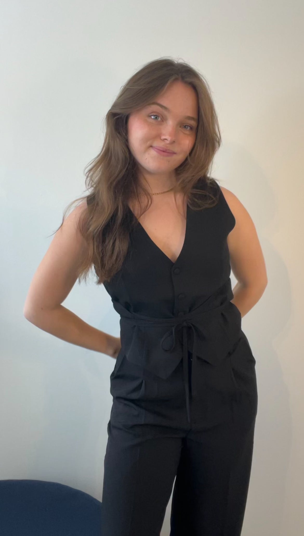 Vest med bindebånd og matchende knapper. Kan bindes på flere måder.